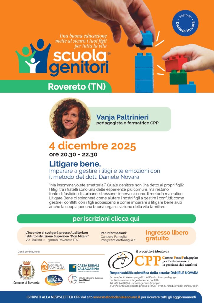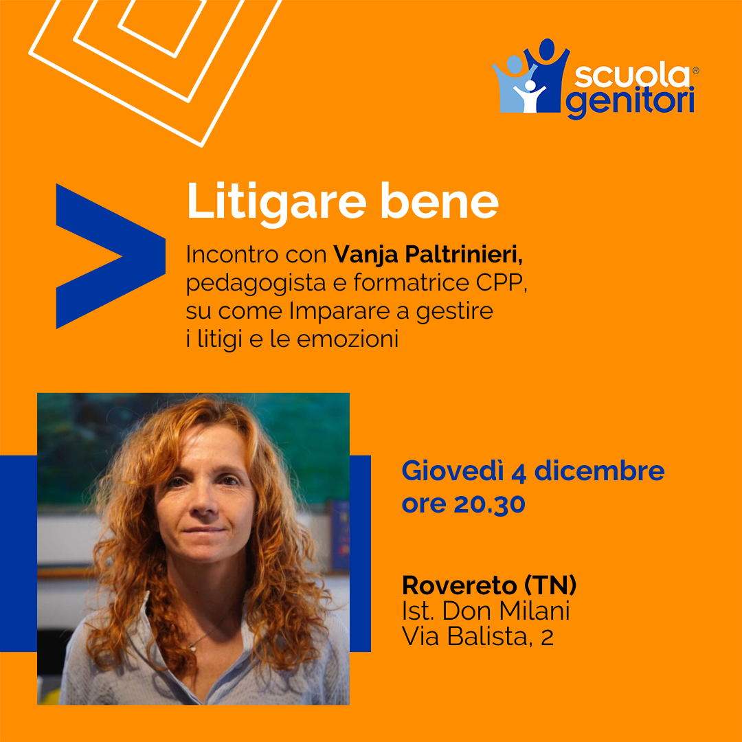 Nuovo incontro della Scuola Genitori di Rovereto (TN), insieme a Vanja Paltrinieri, giovedì 4 dicembre alle 20.30 presso l’auditorium dell’Istituto Superiore Don Milani, Via Balista, 2